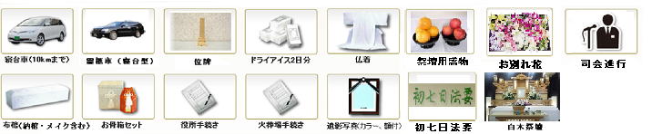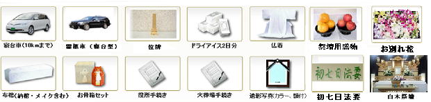 ●通夜、葬儀会葬品 ●湯かん ●貸衣装 ●御供花・御供物 ●お料理 ●特注棺 ●マイクロバス ●後祭りセット